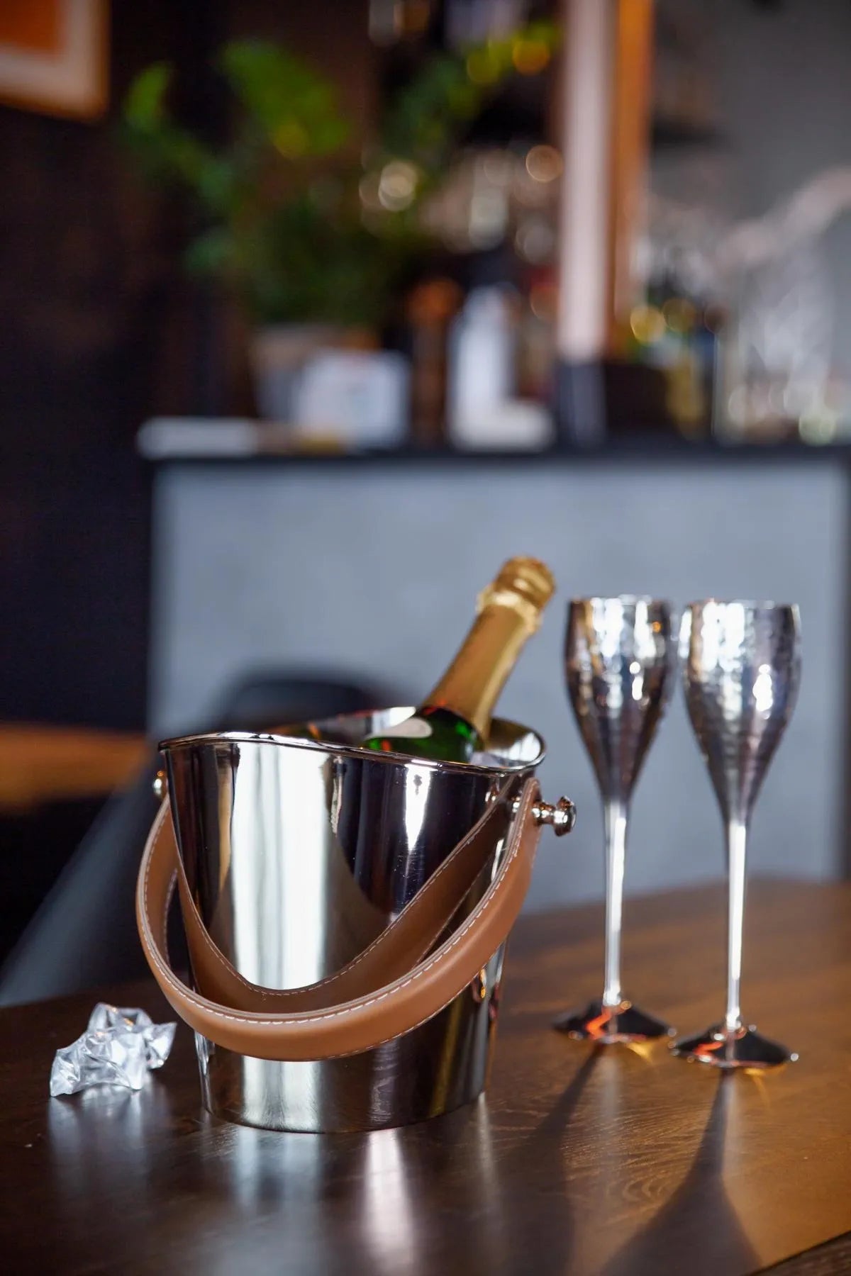 Le seau à glace Gilbert séduit par son design contemporain et raffiné, rehaussé d’une anse contrastante en cuir marron qui lui confère un style chic et intemporel.