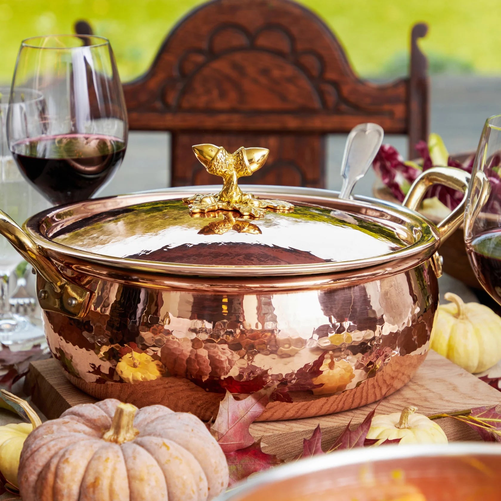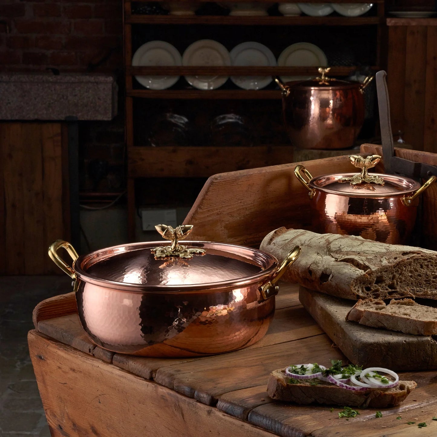 Hand wash with a soft sponge and mild detergent, then dry immediately with a soft cloth. With use, copper develops a rich patina over time that many love and cherish. To restore a polished shine, use a good copper polish (such as Ruffoni Cleaner) or salt with lemon juice or vinegar.