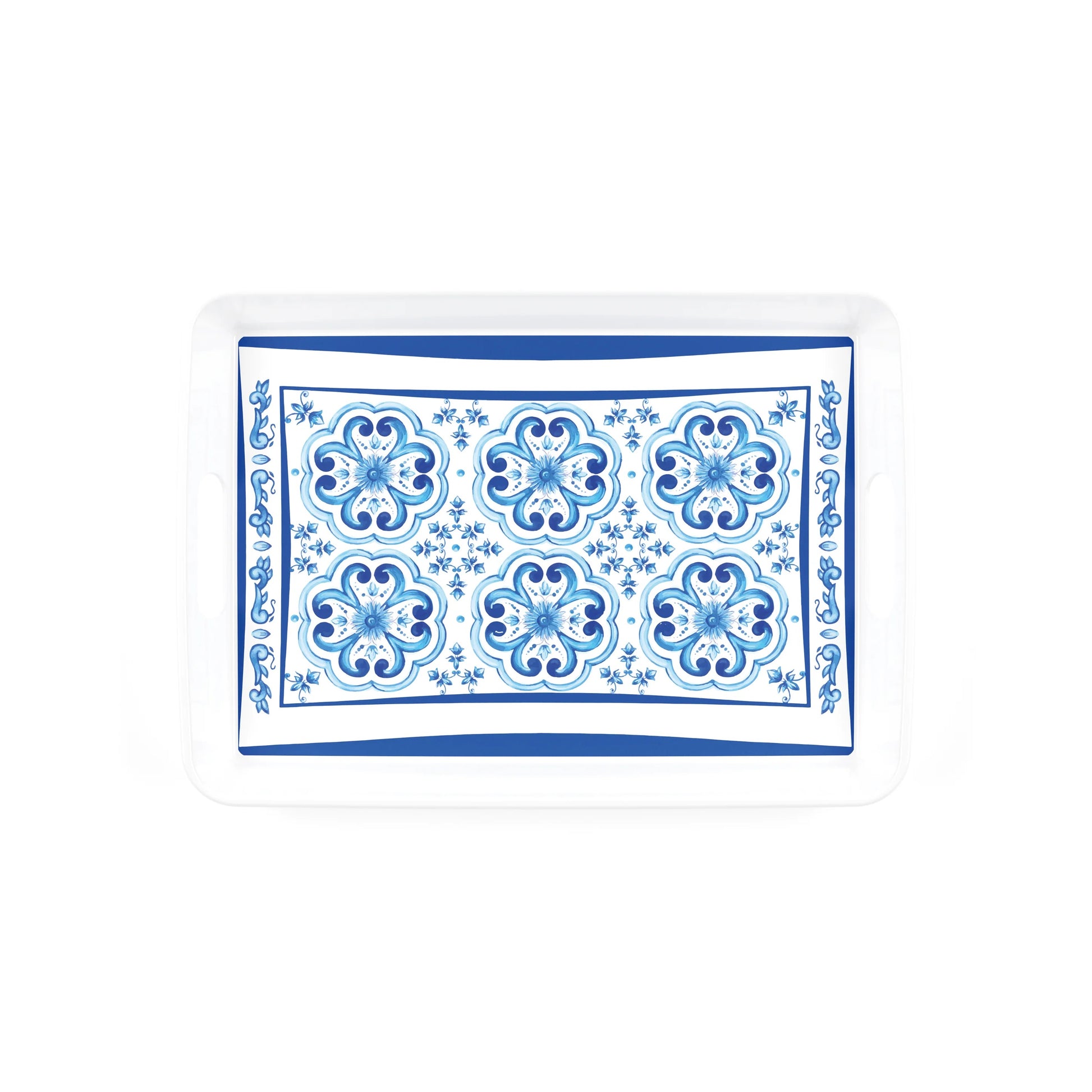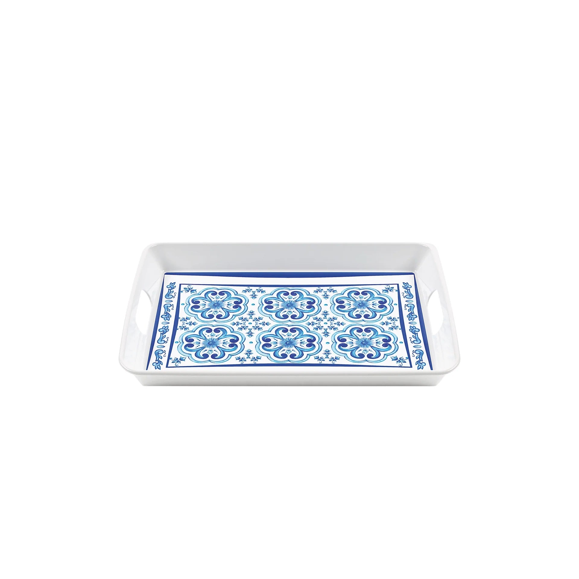 Le plateau rectangulaire avec anses en mélamine 'Blues' nous ramène à la vitalité de la mer : les tons bleus intenses et les motifs sinueux évoquent l'été, la fraîcheur de l'eau, les vues époustouflantes sur un bateau ou au bord d'une piscine, pour une table élégante et originale.