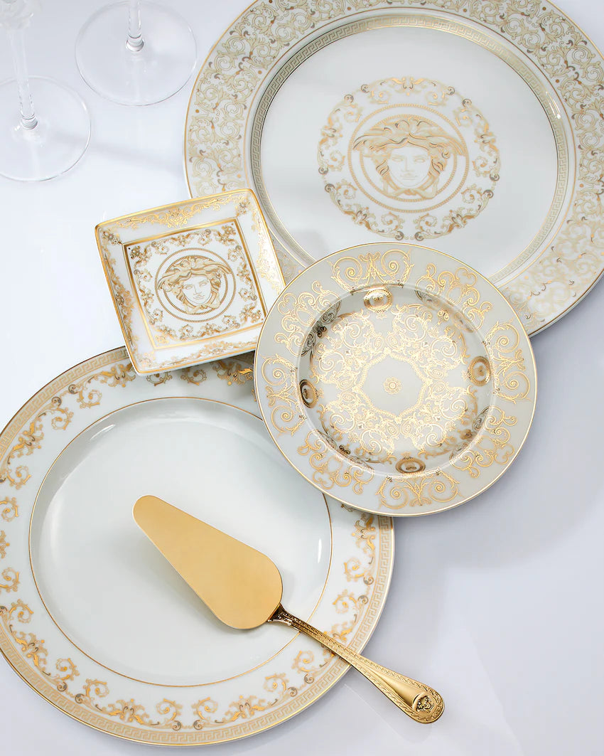 Découvrez l’assiette à dessert Médusa Gala de Versace, réalisée en porcelaine fine et rehaussée du décor baroque doré emblématique de la Maison. Elle mêle volutes, frises et détails dorés pour une allure sophistiquée. Élégante et raffinée, elle sublime desserts, douceurs et instants sucrés avec éclat.