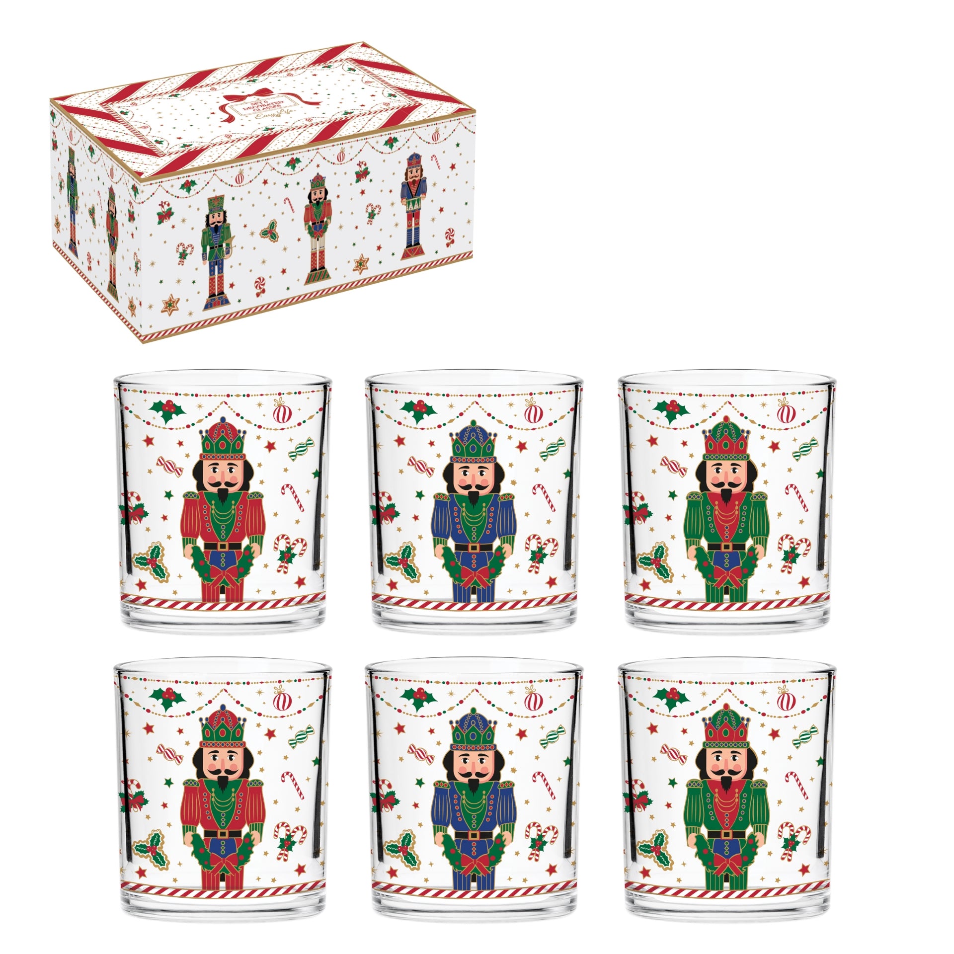 Apportez une touche de fantaisie et d'élégance à votre table avec ce coffret de 6 gobelets en verre décorés. Inspirés du célèbre conte du Casse-Noisette, chaque verre de 25cl présente un design festif unique, orné de soldats de bois, de cannes à sucre, d’étoiles et de houx.